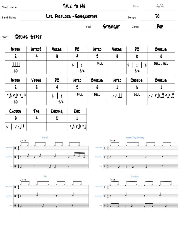 Print this chart and play along with the track. This song was written by Liz Ficalora in the 80’s and it has a funky and smooth R&B feel. I played it with sticks and tried to keep off of beat one to keep with the keyboard rhythm feel. This chart was built with the Drum Chart Builder App.
