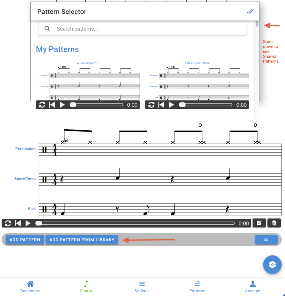 - Scroll down to select patterns from the Shared Patterns library to add to your chart.