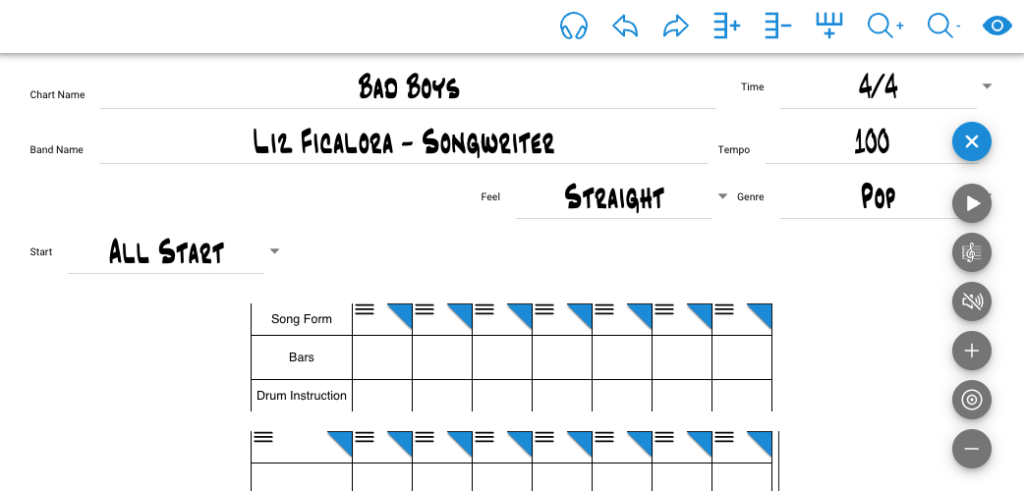 Select Add Pattern to open the Drum Pattern editor. Select the edit button at the bottom right to open the drum pattern template. Use the Drum Pattern Editor to notate the drum patterns at the bottom of the chart for each song form.