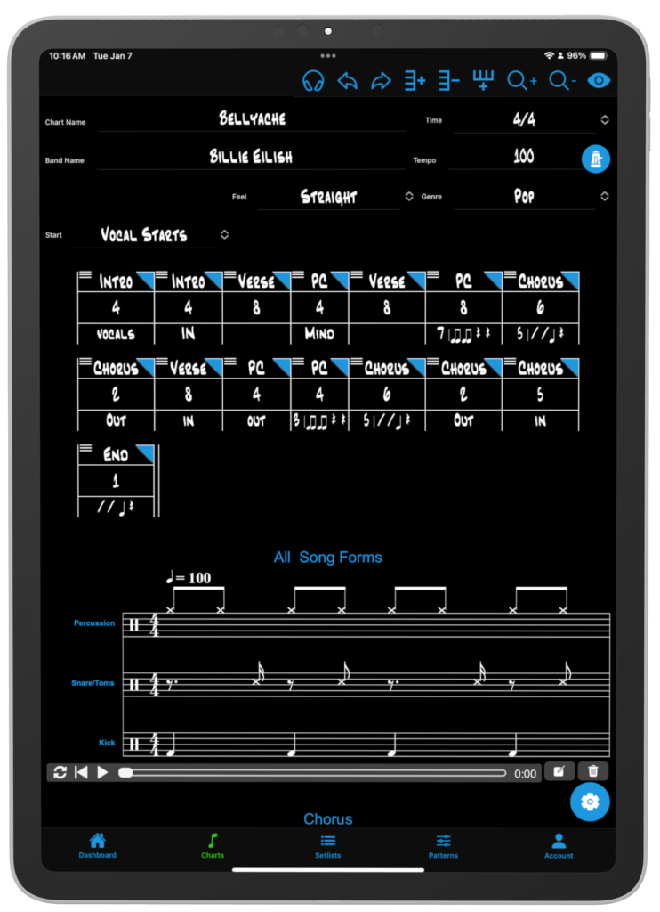 4. Create a Drum Chart: Use the Drum Chart Builder app to build a simple and easy drum chart with very little notation. Start by setting the time signature and establishing the rhythm and groove of the song. Use standard notation symbols, note durations, accents, rests, and other markings to accurately represent the drum part you want to play. Consider dynamics, fills, and variations as well.