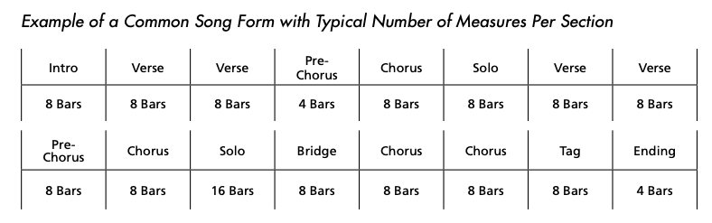 Identifying the parts of a song allows you to see the whole picture. When you know how many bars are in each part of the song, you will be able to play a better musical phrase. Popular songs are constructed with musical phrases that are usually eight bars in length. When these phrases, or sections, are chained together one after another, it creates a song. To create your chart, you will have to identify all of the sections that make up what is called the song form. The following is a breakdown of the different sections of a song, with detailed descriptions of their function within the song.
