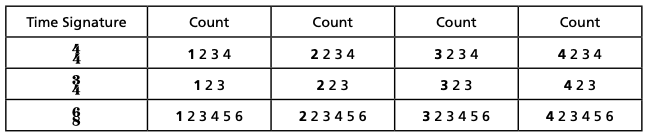 The following chart shows you how to count four bars in 4/4 3/4, and 68 time signatures. Counting out bars is important to performing a song accurately. Before you start listening to the drum part in a song, you should count out your song form first. Practice listening for musical phrases that can quickly help you identify the song form. This method of counting will help you keep an accurate tally of the number of bars in a song.